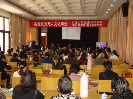 10月30日下午,市疾控中心健教所与市妇联、市级机关工委在彩衣街社区联合开展“粉红丝带月”公益宣传活动。由市疾控中心心理健康免费咨询室副主任江晓昀为来自市级机关的150多名妇女干部及社区代表们进行心理保健知识专题讲座,以乳腺疾病患病心理分析与疏导为重点。