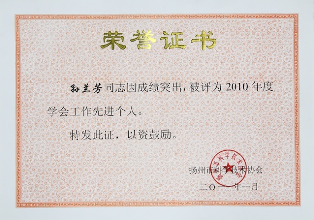 为推进学会工作的改革与发展,促进学会管理水平的提升,2011年1月19日市科协表彰了2010年度部分先进单位和先进个人。扬州市预防医学会获得建设会员之家先进单位,学会副理事长兼秘书长孙兰芳获得学会工作先进个人。