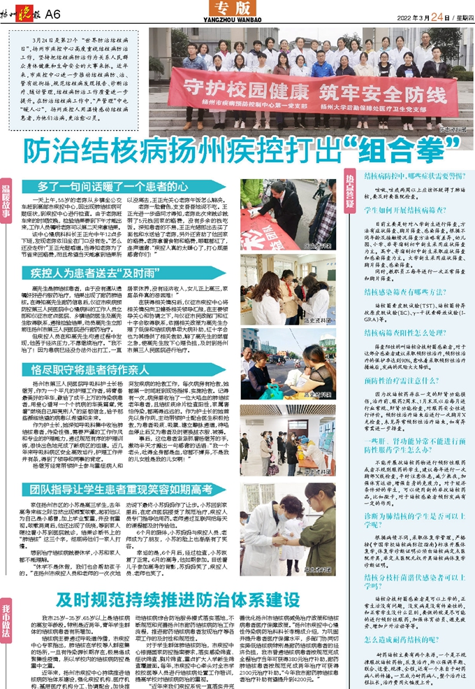 为更好地配合新冠疫情防控措施,市疾控中心调整了原定宣传方案中的部分线下活动,提前一周向各校区下发电子版海报、宣传视频和宣传品,同时通过直播和科普短视频进行预热宣传,组织开展结核病知识微信有奖答题活动,在高等院校附近的公交站台投放大幅宣传海报,并在扬州日报发布整版结核病防治知识热点答疑,形成全民参与的良好宣传氛围 。