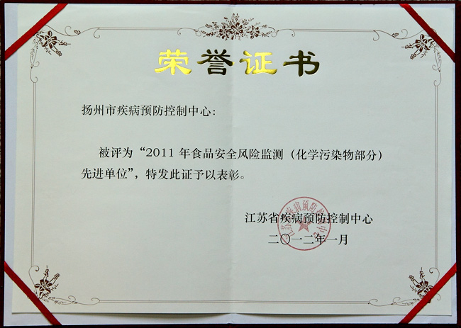 2012年江苏省食品安全风险监测方案(污染物部分)工作会议于2012年1月13日至1月14日在省疾病预防控制中心召开。此次会议上,扬州市疾控中心食品安全风险监测工作得到省中心表彰,被评为“2011年食品安全风险监测(化学污染物部分)先进单位”。
