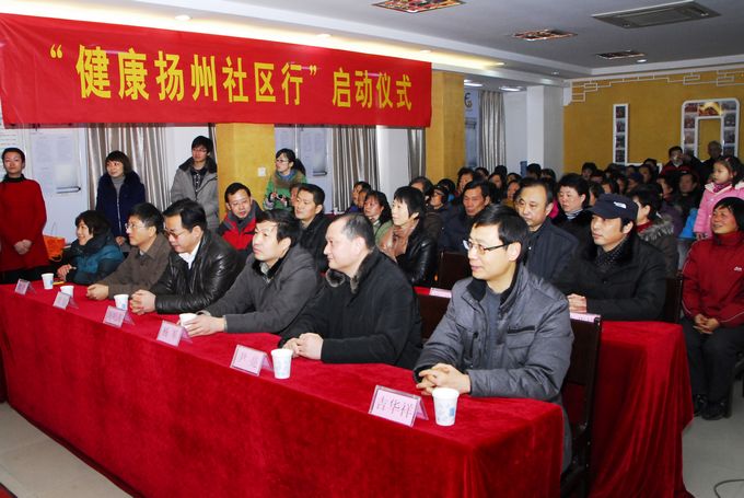 1月25日上午“健康学堂”进社区暨2013年“健康扬州社区行”活动首场仪式在文昌花园社区隆重举行。市卫生局局长杨军、副局长尹亮、市广电总台负责人一起参加了活动。活动期间,市卫生局、市广电总台等领导深入社区卫生服务中心、康复训练中心、社区心理辅导室与广大百姓就健康知识、健康行为、健康需求等方面进行了解与互动。杨军局长在本次活动中要求全市医疗卫生工作者要把普及健康知识,传递健康信息作为自己工作的职责,走进社区到群众中去,把健康知识、卫生服务直接送到老百姓的家门口,同时他向在座的群众,并通过电波向全市广大群众表示新年的健康祝福!