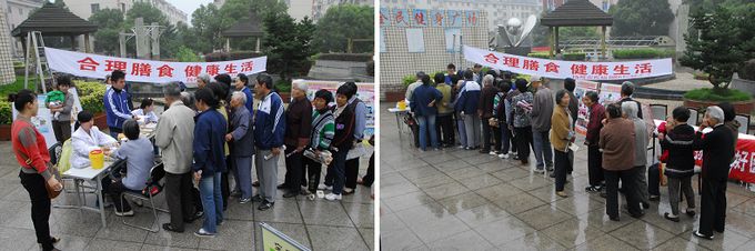 本次活动通过设立咨询台、发放宣传资料、悬挂宣传标语、摆放宣传展板等多种形式积极向群众宣传营养膳食知识。来自我中心门诊部的医护人员义务为居民测量血压、血糖,给出饮食、生活建议;卫生监测科与健康教育所的同志接受群众关于膳食营养的咨询,指导不同年龄段的居民合理摄取膳食营养。
