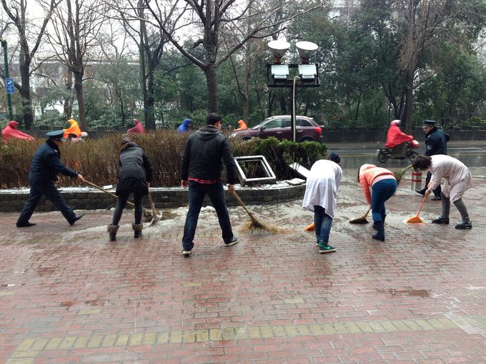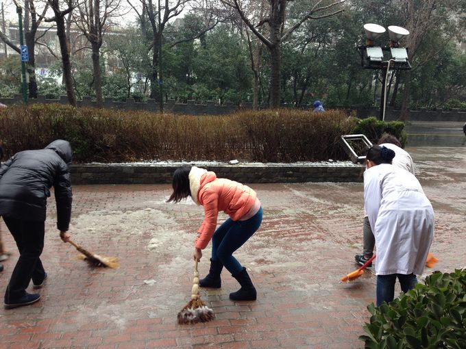 今天是春节假期后的第一个工作日,连夜的大雪给城市披上白色的盛装的同时,也给道路交通、群众出行带来了诸多不便。为防止路面结冰和方便体检者和同事们的安全出行,广大青年同志们不畏严寒、挥洒热情,他们以青春的名义给我们的新春带来一股浓浓的“暖意”。