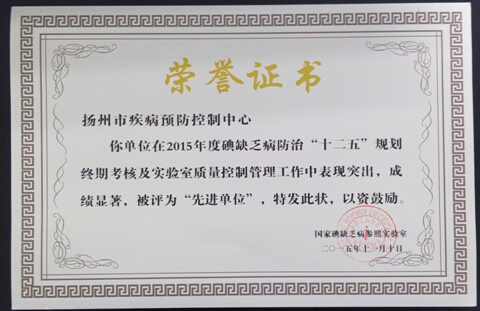 此次荣誉为国家碘缺乏病参照实验室颁发,用于奖励2015年度碘缺乏病防治“十二五”规划终期考核及实验室质量控制管理工作中表现突出的单位及个人。