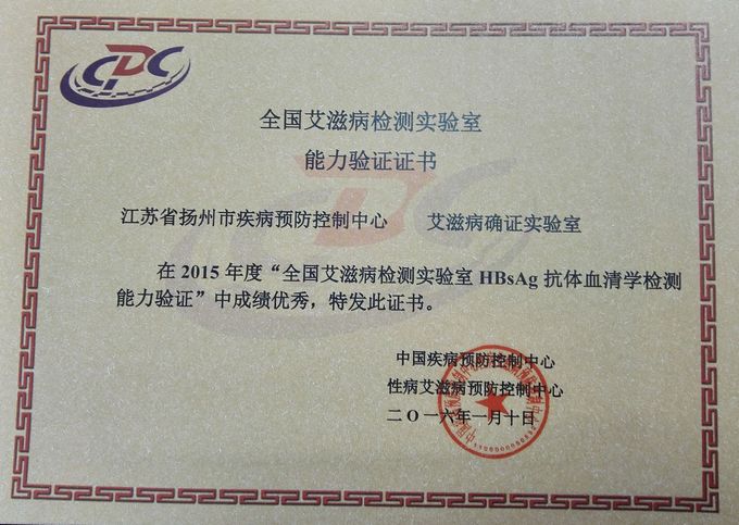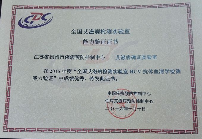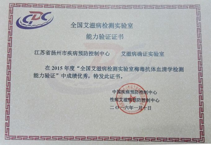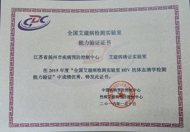 市疾控中心参加2015年度全国艾滋病检测实验室能力验证,在14年的基础上连续两年得到能力验证优秀的好成绩。