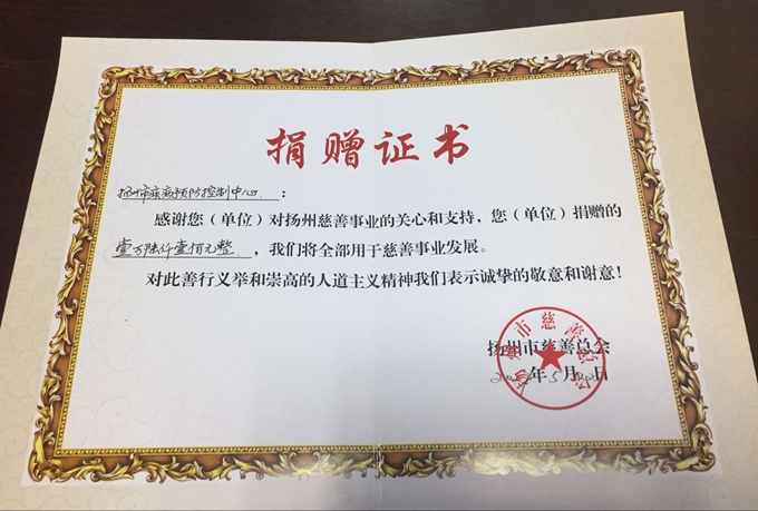 为大力弘扬中华民族乐于助人、乐善好施、扶危济困的传统美德,倡导“依法慈善、人人慈善、惠民慈善”的全民慈善理念,中心积极响应扬州市市政府发出的关于开展第十六个“5.19慈善一日捐”活动的号召,中心干部职工111人积极参与,共捐款16100元,所得善款已全部汇入扬州市慈善总会。