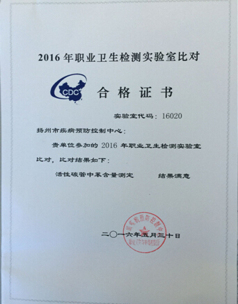 今年4月,市疾控中心检验科参加了由中国疾病预防控制中心职业卫生与中毒控制所组织的2016年职业卫生检测实验室比对,结果满意。本次比对为活性碳管中苯含量测定,包括两个未知浓度的碳管。这是检验科继2015年参加中疾控组织的三氯乙烯含量测定比对结果满意后再次获得比对合格证书。