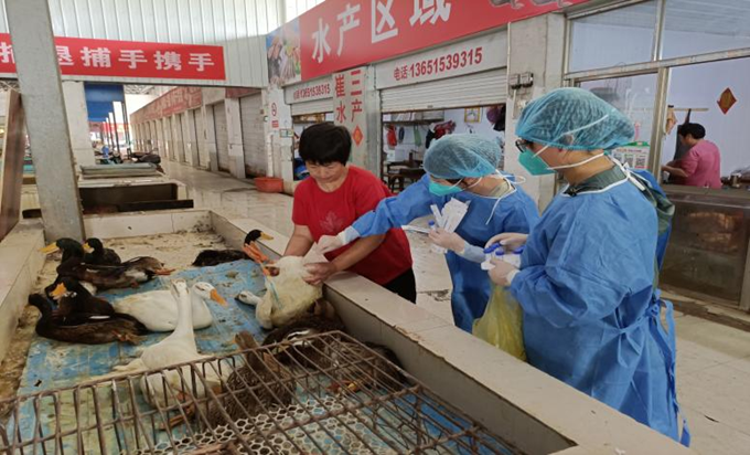 2022年6月23日上午,扬州市疾病预防控制中心急传科和应急办(消媒科)业务骨干一行4人,前往仪征市青山镇和新集镇,开展禽流感外环境监测工作。此次外环境监测工作选取乡镇农贸市场作为监测点,采集禽家禽粪便样本、笼具标本擦拭样本、案板表面擦拭样本、宰杀工具表面擦拭样本、清洗污水等各类型样本共计70份。