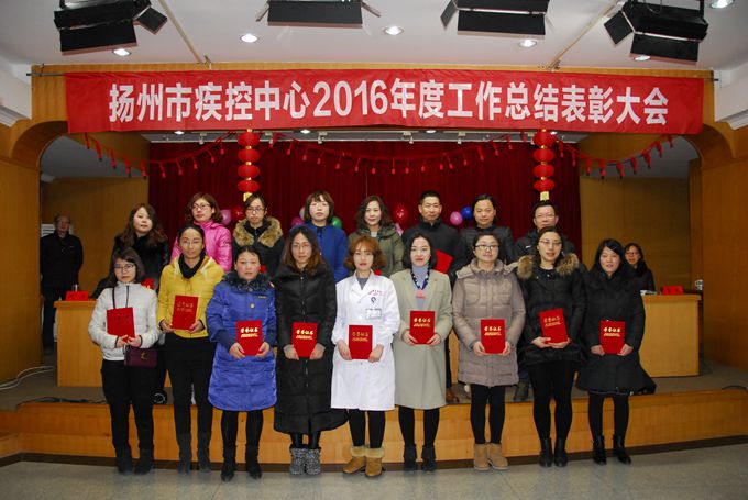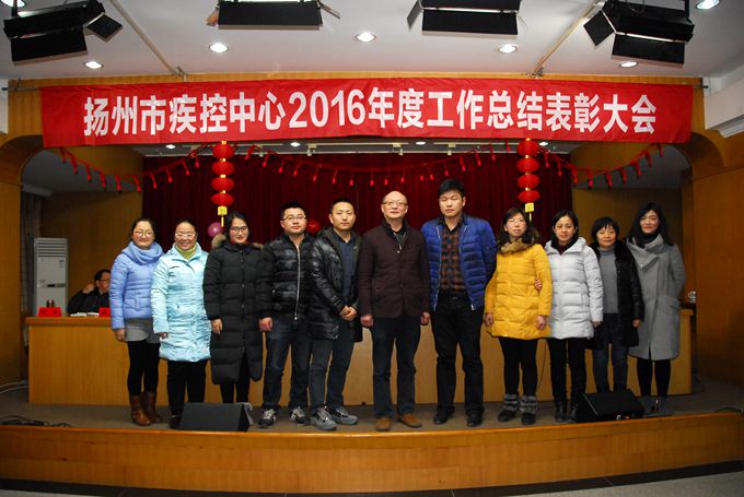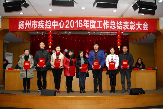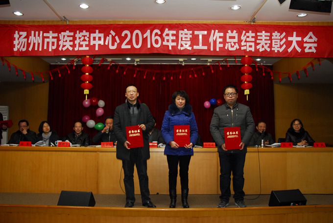 朱道建主任首先全面总结了中心2016年工作,并致新年贺词。他从把握机遇,创新发展,切实担负起疾控事业发展的重大使命;凝心聚力,深化医改,努力激发出改革创新发展的蓬勃活力;真抓实干,攻坚克难,努力开创疾病预防控制工作的崭新局面等三个方面总结中心2016年工作。他指出,2016年,中心在市卫生计生委的领导下,全体干部职工以强烈的使命感和责任感,积极进取、奋勇争先,喜获佳绩!一年来荣获省卫计委“江苏省免疫规划(预防接种)工作先进集体”、“省重点职业病监测与健康风险评估先进单位”、市卫计委“2016年度市直卫生计生优秀单位”、“先进基层党组织”、“庆祝建党95周年市卫计委系统微电影评比一等奖”等。他期望2017年全体干部职工更大努力干好工作,紧盯目标任务、加强内涵建设和内部管理,重点干好三件大事,一是加快市公共卫生中心项目建设;二是加快质量管理体系信息化建设;三是加快“大疾控”体系建设。张军副书记宣读《市疾控中心关于表彰2016年度先进集体和先进个人的决定》和《2016年度事业单位工作人员考核“优秀”等次人员名单》;在欢快喜庆的乐曲声中,出席表彰大会的市卫生计生委领导和中心领导向获表彰的先进集体、先进个人颁发荣誉证书和奖状并合影留念。