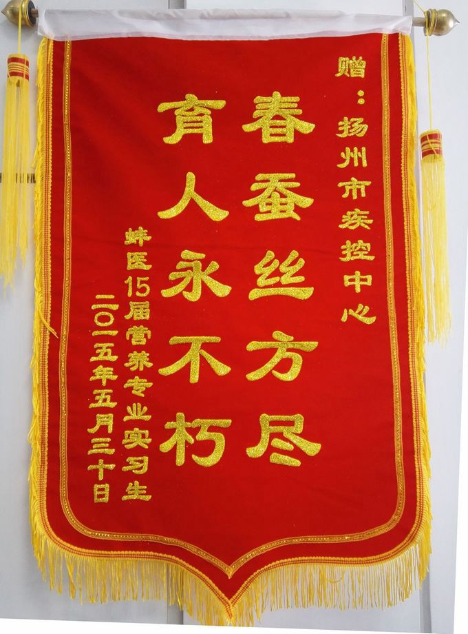 6月1日,蚌埠医学院15届营养学专业实习生代表将一面写有“春蚕丝方尽 育人永不朽”的锦旗赠给市疾控中心,顺利完成在中心的学习。 2014年6月,蚌埠医学院营养专业8人来中心进行为期1年的实习。中心为他们制定了详细的实习计划,提供良好的生活条件;安排理论知识强、工作经验丰富的指导老师。实习生在良好学习环境和带教老师的悉心指导下,加强基础知识学习,苦练实践技术技能,圆满完成各项学习任务。