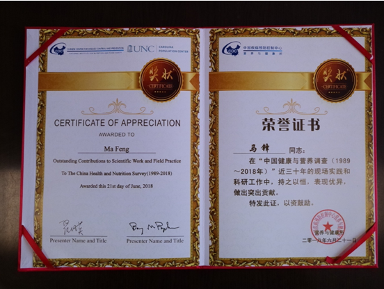 2018年6月21日,中国健康与营养调查项目培训班在浙江省宁波市举行,会议对从事中国健康与营养调查30年的调查员进行表彰,江苏省仅两名同志受到表彰,我中心马锋同志获此殊荣。