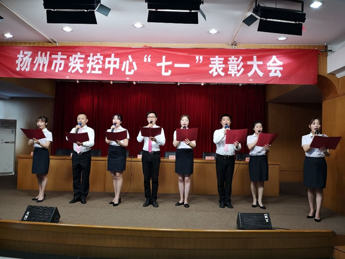 7月1日是中国共产党成立97周年。为了迎接党的生日,为党献礼、为祖国祝福,中心召开了“七一”表彰大会。会上,刚刚获得扬州市委宣传部十九大理论文艺宣讲活动一等奖的中心党建活动文艺宣传队为全体干部职工表演了配乐诗朗诵《党的赞歌》《我的祖国》。