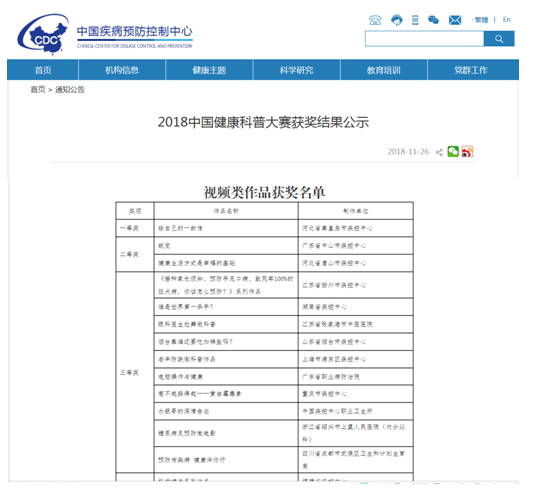 “2018中国健康科普大赛”是由中国疾控中心、中国健康教育中心、中华预防医学会、清华大学国际传播研究中心联合主办。活动共征集到来自各省(自治区、直辖市)有关部门报送的两千余件作品。中国疾控中心组织专家从科学性、准确性、通俗性、可传播性等方面对作品三轮评审,最终评选出162件获奖作品。中心认真组织,从2018年精心制作的近20件科普视频中遴选出12件作品,积极投稿参与了比赛活动。