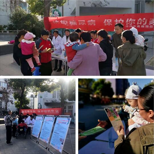 11月14日上午,市疾控中心组织邗江区、广陵区和开发区疾控中心的7名慢性病防控专业人员走进邗江区康乐新村,开展第13个“联合国糖尿病日”健康宣传活动。