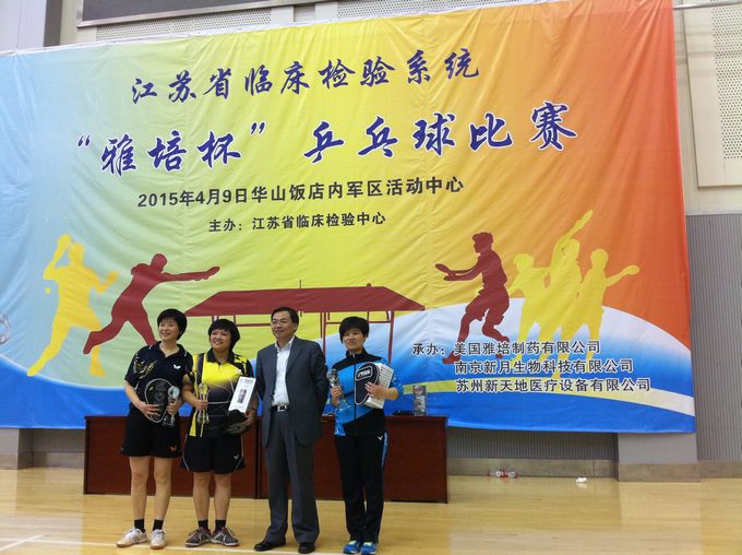 4月9日,江苏省临床检验系统 “雅培杯”乒乓球比赛在南京市华山饭店军区活动中心举行,全省临床检验系统十四支代表队共97名选手参加了此次比赛。 本次比赛分男子组和女子组,其中男子组有67名选手,女子组有30名选手。比赛中,我市代表队7名队员不畏高手,顽强拼搏,经过多轮次激烈拼杀,来自市医学检验中心宋艳一路过关斩将,勇夺女子组单打冠军;市武警医院祝峰获男子组第四名。省临检中心许斌主任到场颁奖并表示祝贺。