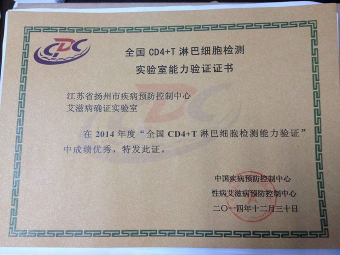 市疾控中心在由中国疾病预防控制中心性艾中心组织的2014年度全国CD4+T淋巴细胞检测能力验证中获优秀成绩。 CD4+T淋巴细胞是HIV感染的主要靶细胞。CD4+T淋巴细胞记数作为直接测定免疫功能的方法,是提供HIV感染病人免疫系统损害状况最明确的指标。 扬州市疾控中心于2013年购置流式细胞仪并开始进行CD4+T淋巴细胞检测,服务于扬州地区艾滋病感染者及病人抗病毒治疗工作,年检测量在1000人次左右。