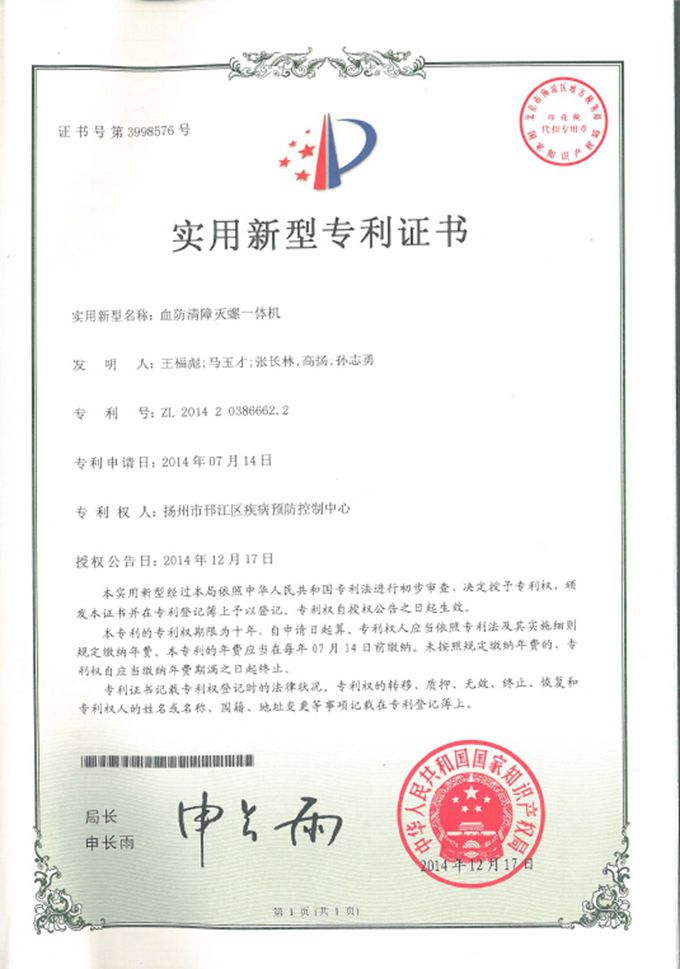 近日,邗江区疾控中心收到国家知识产权局颁发的专利证书,授予血防清障灭螺一体机实用新型专利权,专利号:ZL201420386662.2。