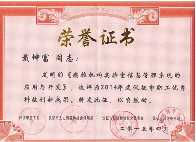 4月28日,由仪征市总工会、市经济和信息化委员会、市科技局、市人力资源和社会保障局联合组织开展了以“推动转型升级,促进创新发展”为主题的第二届仪征市职工优秀科技创新成果、优秀合理化建议和先进操作法征集评选活动落下帷幕。仪征市疾控中心戴坤富同志参与评选的《疾控机构实验室信息管理系统的应用与开发》荣获本届“仪征市职工优秀科技创新成果奖”。