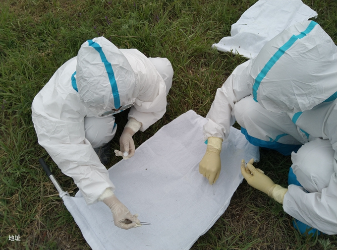 在枣林湾生态园光华水库附近草坪,工作人员采用“布旗法”在选择的样地均匀的拖或挥旗,每隔10米左右,停下来检视并抓捕白布上附着的游离蜱,将附着在布旗上的蜱用镊子捡起装入管内,一地一编号,上送扬州疾控进行相关的分类鉴定和检测工作。共计拖行布旗3600米,捕获野生蜱35只。