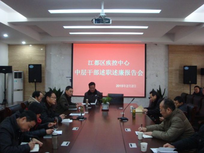 2月2日,江都区疾控中心在北三楼会议室召开2014年度中层干部述职述廉会,会议由吴志明主任主持,中心领导及12个职能科室中层干部近40人参加。