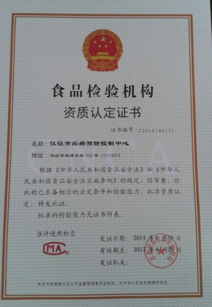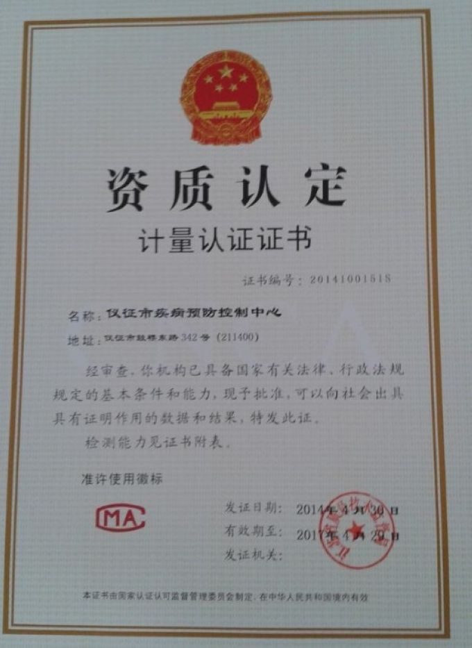 日前,仪征市疾病预防控制中心取得了江苏省质量技术监督局颁发的《资质认定计量认证证书》与《食品检验机构资质认定证书》。