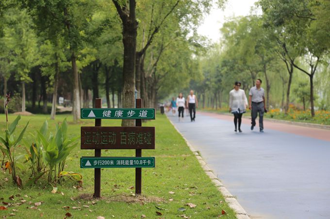 “ 运动运动百病难碰;步行200米,消耗能量10.8千卡”、“ 少油少肉少脂肪,多果多蔬多健康”……这些造型古朴的健康贴士竖立在龙川健康广场的蓝红相拼的健康步道旁,时有锻炼的市民驻足阅读。该步道沿运河设计,长1.2公里,每隔一段距离标有步行的米数,步道一侧设置宣传健康素养、运动医学、养生保健等方面知识的健康教育贴士牌,其下方标注日常生活运动量的转换,沿途每隔一段距离就有多个健康教育宣传栏和标牌、健康驿站、自助体重指数转盘等设施。