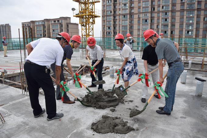 4559 在县委、县政府殷切关怀和有关部门的大力支持下, 6月24日上午9点58分,宝应县卫计委、县疾控中心领导和受邀领导共同浇注县疾病预防控制中心新办公楼的最后一方混凝土,挥锹进行封顶作业,标志着宝应县疾病预防控制中心办公楼主体结构实现顺利封顶。