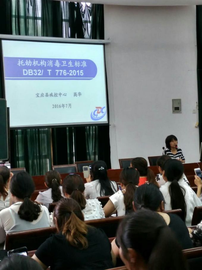 7月7日,宝应县疾控中心在实验小学开展全县托幼机构保育员与保健教师卫生消毒知识讲座。全县49所幼儿园241名保育员、62名保健教师参加了讲座。
