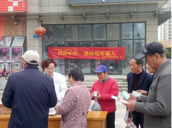 2017年4月26日,广陵区疾控中心、曲江社区卫生服务中心在曲江街道运河水榭社区开展了以“消除疟疾:谨防境外输入”为主题的“全国疟疾日”防治知识宣传活动。 工作人员向群众宣传了疟疾防治相关知识,并发放关于疟疾防治的宣传资料750份,宣传品500多份,接受现场咨询280余人次,受到了居民的热烈欢迎。通过此次宣传有效提升了群众对疟疾的认识,增强了居民对疟疾的防治意识。