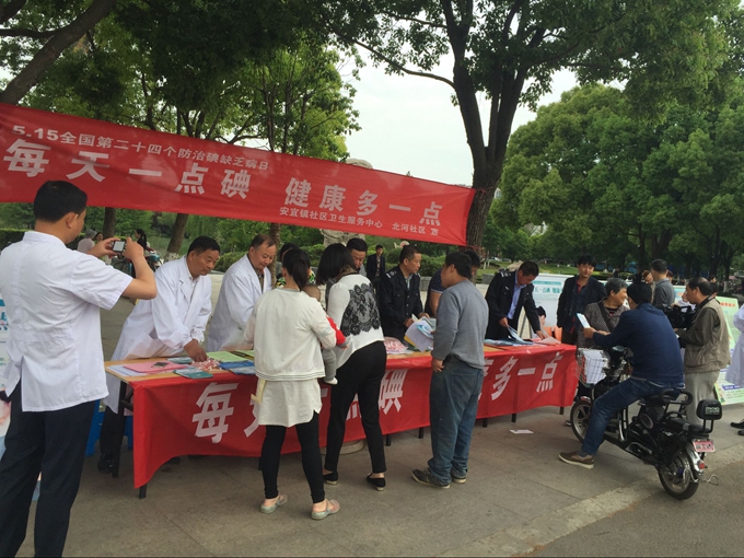 2017年5月15日是我国第24个〝防治碘缺乏病日〞。5月15日上午,宝应县政府血地防办、县卫计委、县盐务局、县广电局、县教育局、县疾控中心、安宜镇社区卫生服务中心等单位联合在北河公园广场开展了宣传咨询活动,现场悬挂〝每天一点碘,健康多一点〞主题横幅,展示戗牌10块,发放碘缺乏病防治宣传材料1200多份及宣传品600多件。活动现场气氛活跃,咨询台前,县疾控中心、盐务局及安宜镇社区卫生服务中心专业人员就市民关心的碘缺乏病危害、如何防治以及真伪碘盐鉴别等热点问题,作了详细解答。