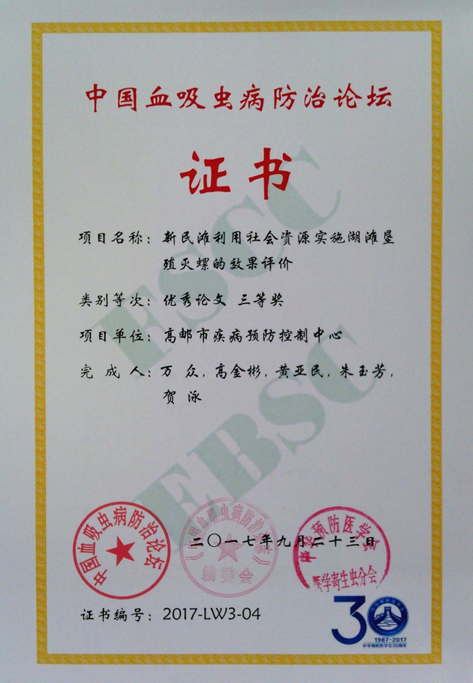 第二届中国血吸虫病防治论坛由中华预防医学会和中国血吸虫病防治杂志编委会举办,本届论坛秉承了“共同血防、共同事业、共同健康”的宗旨,以 “实施精准防控,加快消除进程”为主题,来自全国血吸虫病流行区的80多家各级血防管理部门和专业机构,以及高等院校、生产企业的200余名专业技术和管理人员参加了本届论坛,共同交流近年来我国血吸虫病防治研究取得的新进展、新经验、新成果,展示了血防科技创新中取得的新技术,研讨了当前我国在向消除血吸虫病进程中面临的新挑战和新问题。高邮市疾控中心参评论文《新民滩利用社会资源实施湖滩垦殖灭螺的效果评价》,经本届论坛学术委员会评审、主席会议审核确认,在论坛上脱颖而出,喜获优秀学术论文三等奖,成为全国十篇获奖论文之一,也是全国唯一连续两届荣获优秀学术论文奖的县级单位。