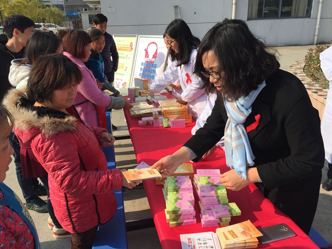 12月1日上午,江都区疾控中心与区妇联等四家单位联合在我区大桥镇的扬州国汇箱包有限公司开展了预防艾滋病现场宣传活动。
