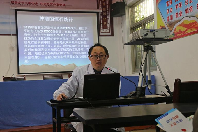 在义诊现场,医务人员为前来参加活动的老年群众及附近居民免费测血压、血糖等检查。共为200余位群众进行了义诊,发放肿瘤宣传手册、宣传资料等600余份,此次活动还特邀了区人民医院肿瘤专家褚主任接受现场群众的咨询,受到广泛好评。同时在龙城社区活动室举办了由区中医院肿瘤内科华主任做了题为《让肿瘤远离我们》的讲座。讲座结束后,发放健康水杯、限油壶等健康宣传用品200余份。