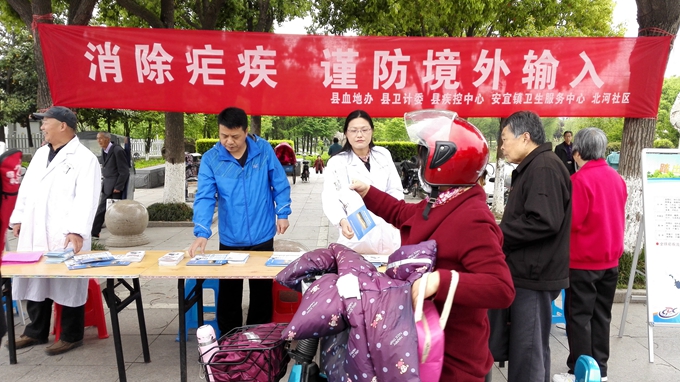 为增强居民疟疾防病知识和自我保护意识,切实保障人民身体健康。4月24日,宝应县血地防办公室、县卫计委、县疾控中心、安宜镇社区卫生服务中心和白田社区服务中心联合在白田北河广场开展第11届疟疾4.26宣传活动,现场悬挂〝消除疟疾:谨防境外输入〞主题横幅,展示戗牌5块,发放疟疾防治知识、《致劳务输出人员一封信》等多种宣传资料,并接受社区居民咨询。专业人员现场耐心讲解输入性疟疾的危害,并告知如有亲友出国劳务回来后,一定要主动采血检查疟原虫,以防患疟疾,宣传活动现场气氛十分活跃。
