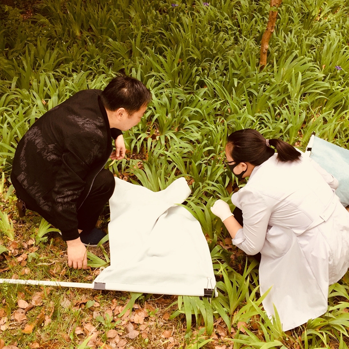 4月26日下午,仪征市疾控中心3位工作人员选择东园湿地公园、原红旗村荒坡草地现场开展蜱监测,采集游离蜱,检查家畜体表上的寄生蜱等。