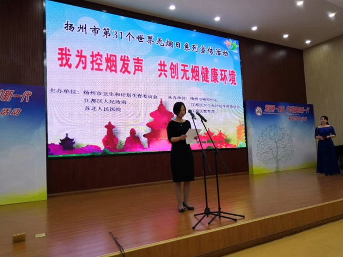 2018年5月31日是第31个世界无烟日,今年的主题是“我为控烟发声——烟草与心脏病”。为推进健康中国扬州样本建设,巩固国家卫生城市成果,加大控烟宣传和健康教育工作力度,进一步倡导无烟生活理念,5月31日,由扬州市卫生和计划生育委员会、江都区人民政府、苏北人民医院主办,江都区卫生和计划生育委员会、江都区教育局、江都区疾控中心承办的“我为控烟发声、共创无烟校园”主题活动在江都区第二中学报告厅举行,共计400余名师生参加。