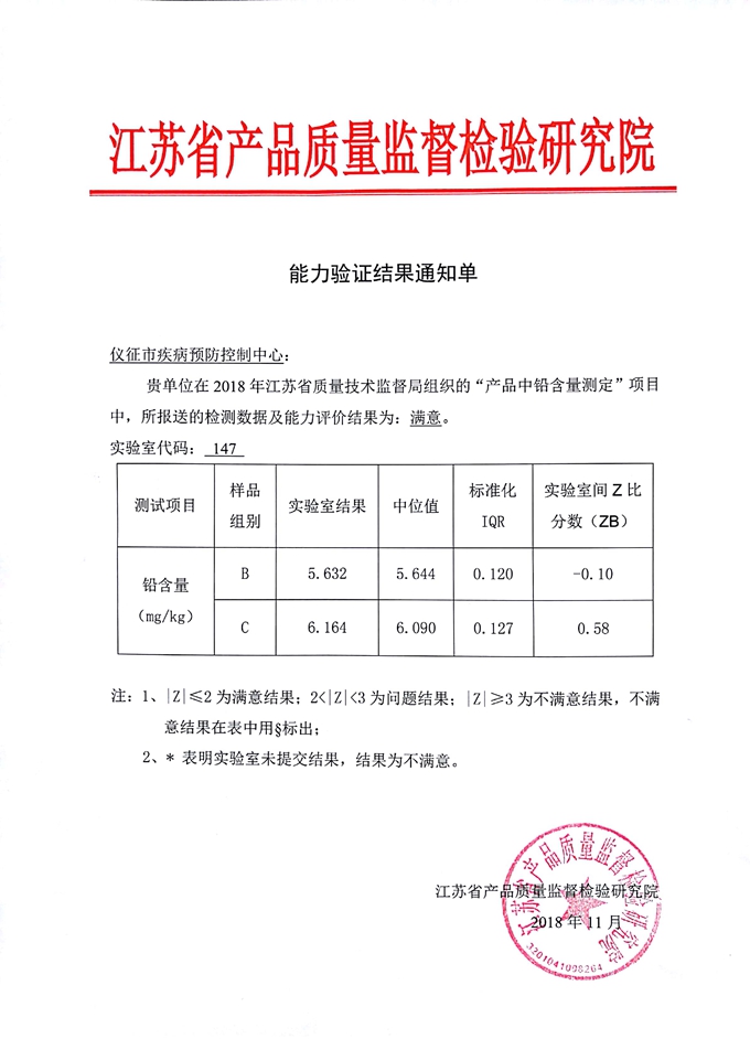 近日,从江苏省市场监督管理局《关于2018年产品中铅含量测定能力验证结果的通报》(苏市监办函[2018]63号)和《关于2018年江苏省食品中金黄色葡萄球菌检测能力验证结果的通报》(苏市监办函[2018]64号)文件获悉,仪征市疾病预防控制中心顺利通过了全省检验检测机构产品中铅及食品中金黄色葡萄球菌(定量)能力验证考核,评价结果均为满意。
