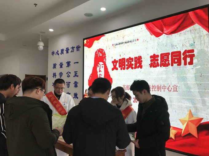 高邮市疾控中心门诊大厅彩屏上“文明实践 志愿同行”的主题标语分外醒目,中心党、团员志愿者通过一问一答,实例讲解的方式与企业员工分享了艾滋病、结核病、呼吸道传染病、高血压、职业卫生、合理膳食等12种重大疾病和传染病防治及健康文明生活方式的相关知识,受到了企业员工们的纷纷点赞。现场共发放健康宣传小册100余份。目前,该中心全体职工都是高邮市文明委组织的志愿者,其中 “春晖”志愿小组更是连续2年获得省“优秀宣传团队”称号,用职业热情弘扬文明新风,传播社会正能量,谱写了一曲新时代的雷锋之歌。