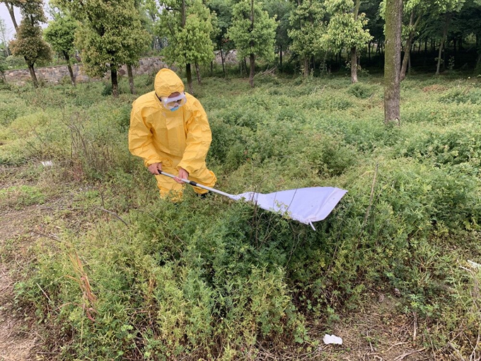 监测现场采用布旗法进行拖蜱,高邮疾控中心专业技术人员身穿防护服,戴着护目镜手执1米多长的白绒布慢速直线行走,白布拖于地面,每行进10米,都会检视白布上附着的虫子是否为蜱虫,近1个半小时共拖蜱距离1千余米,为进一步了解掌握高邮市蜱虫的种类、密度分布、季节消长规律及带毒情况制定蜱传疾病防制措施提供了科学依据。