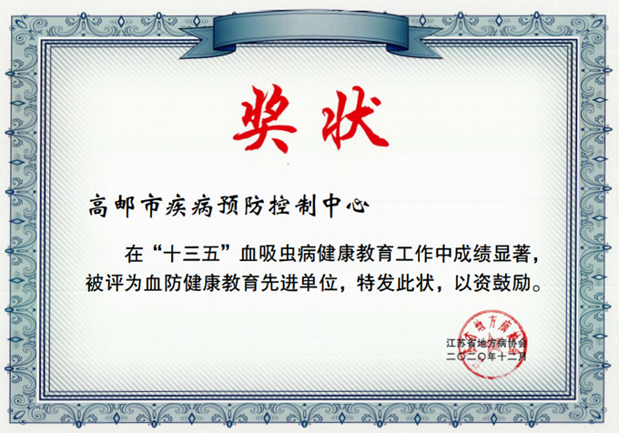 “十三五”期间,高邮市疾控中心紧紧围绕血防目标任务,以血吸虫病健康教育示范社区和示范学校创建为抓手,以涉水人员及学生为重点人群,全面开展了血吸虫病健康教育和健康促进工作,共发放宣传单 14万余份,制作宣传栏696期,张贴宣传标语1142张,设置警示牌、警示器25个,实用宣传材料1810件,播放血防视频364场,受健康教育人次数达116万余次,并结出累累硕果,其中,2017年,高邮市疾控中心1幅作品获中国地方病协会举办的“绿水青山、疫区新貌”血防主题摄影大赛工作场面专题一等奖。2018年,高邮市秦邮实验小学孙欣语、潘妍两名同学在扬州市血地办举办的小学生血寄防知识手抄报比赛活动中获评三等奖。2019年,江苏卫视以高邮血防工作为素材报道高邮市建国70年卫生健康事业取得的丰硕成绩。2020年,对示范学校秦邮实验小学和示范社区新民村居民进行效果评估,结果表明:血防知识知晓率居民和学生分别为94.6%(492/520),95.3%( 467/490),达到省级要求。2020年9月,全省唯一的县级展览馆——高邮市血防展览馆完成了异地新建,成为全国血防工作、特别是湖沼型血吸虫病流行区借鉴丰富而宝贵防治经验的重要平台和血吸虫病防治知识科普基地。