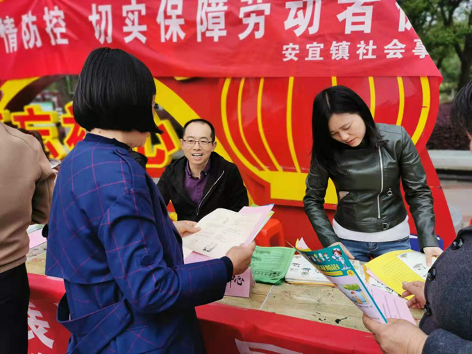 4月26日7点30分宝应疾控中心、卫健委、人社局、民政局、医保局、总工会、安宜镇政府等部门在白田广场联合开展《职业病防治法》宣传周活动。