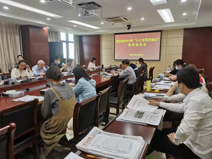 2021年5月31日是第34个世界无烟日,为贯彻落实《健康中国行动2019-2030年》》控烟行动有关要求,有效提升人民群众烟草危害健康知识水平,5月28日下午,宝应县组织召开了“5.31世界无烟日”活动动员部署会。城区各医疗卫生单位、镇卫生院(社区卫生服务中心)分管领导、防保所所长、健康教育工作相关人员共计30人参加。县卫健委爱卫科科长谢朗出席会议并就主题宣传活动相关工作进行了全面部署。