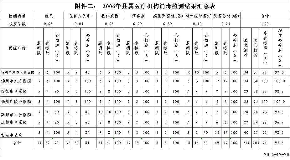 10483 根据《中华人民共和国传染病防治法》、卫生部《消毒管理办法》规定,按照江苏省卫生厅关于开展医疗机构消毒质量监测工作的通知(苏卫疾控[2006]22号)要求,二00六年度扬州市疾控中心对市直和县级医疗机构消毒质量进行了统一监测,结果通报如下: