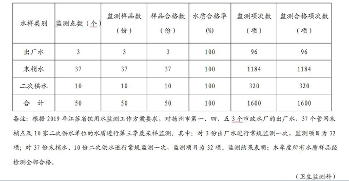 2019年第三季度扬州市城市生活饮用水水质卫生监测情况统计表